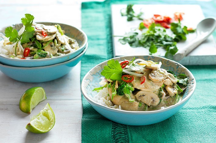 Add coconut milk and bring to the boil. Reduce heat to low, return chicken and mushrooms and any juices to the wok. Simmer for 10 minutes or until chicken is cooked through.